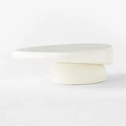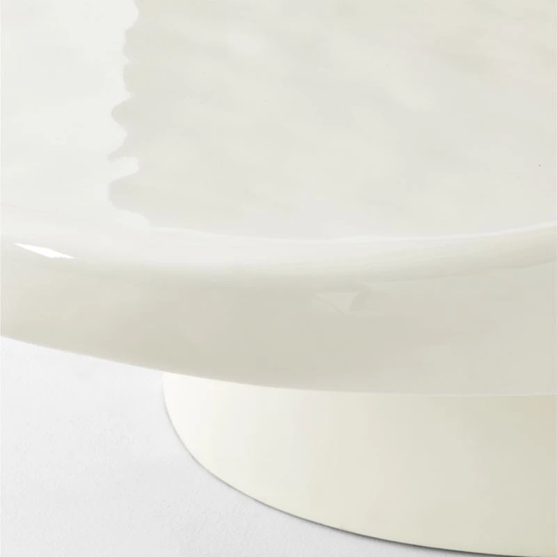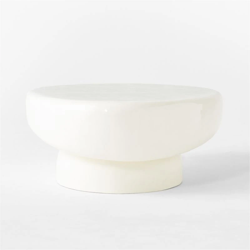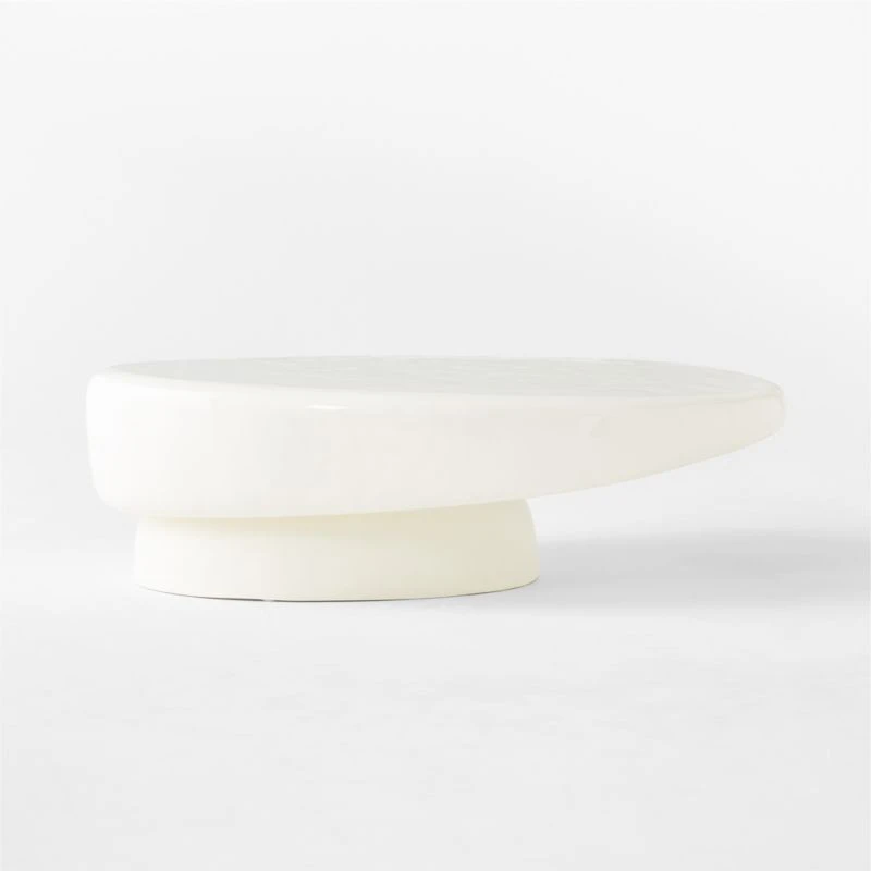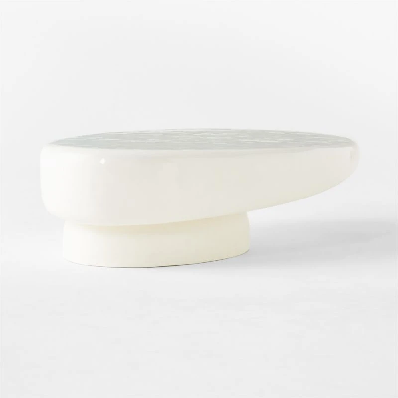Fabricated of cast concrete, designer Caleb Zipperer’s oval coffee table emphasizes its organic silhouette through compelling, complementary textures.. The warm white finish is supremely glossy on top to draw attention to the table’s soft, undulating surface. Beneath, the matte base lends subtle contrast. Elegant in its simplicity and eye-catching in its execution, Alastor is a dramatic anchor for the living space. CB2 exclusive.