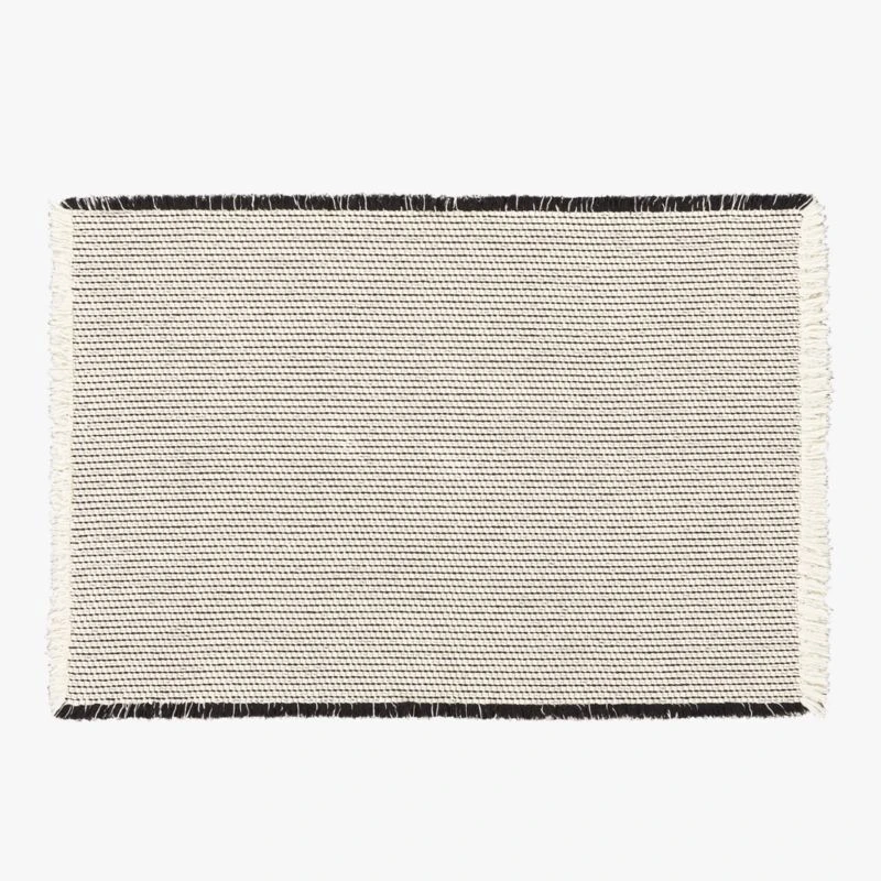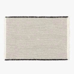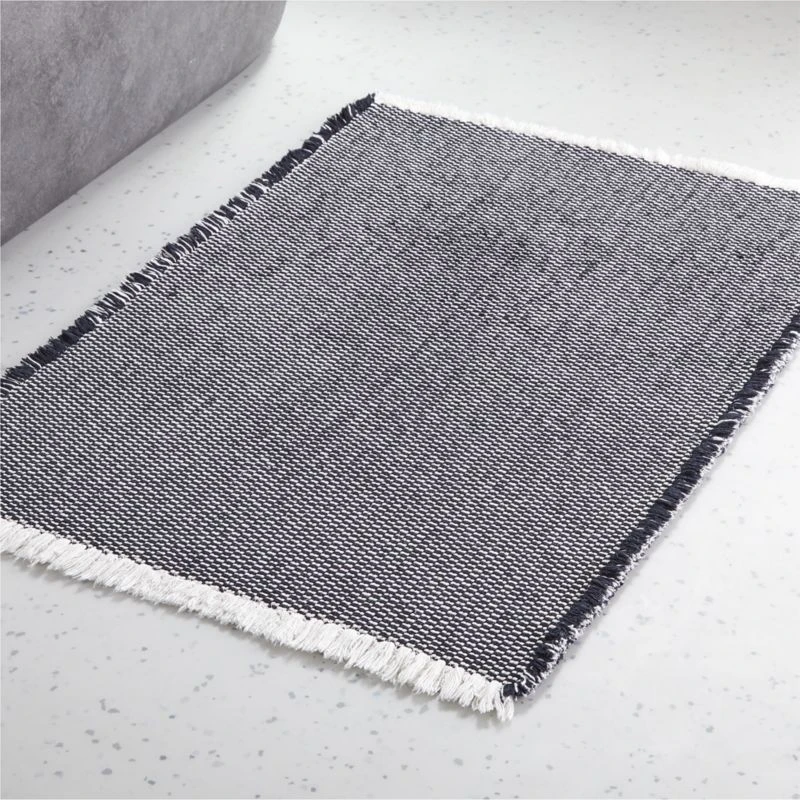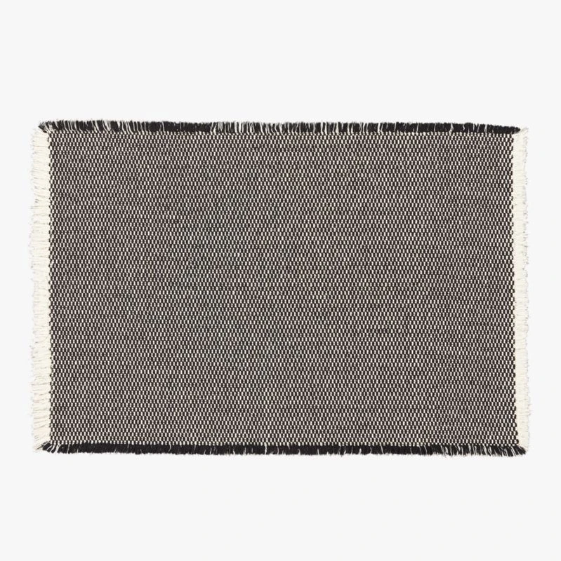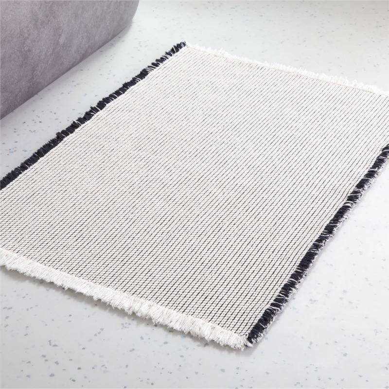 Soft underfoot and ultradurable, black and white patterned rug is everything you want in a bath mat. Finished with eyelash fringe on the edges for an elevated look in the bath. Reverses for even wear. CB2 exclusive.