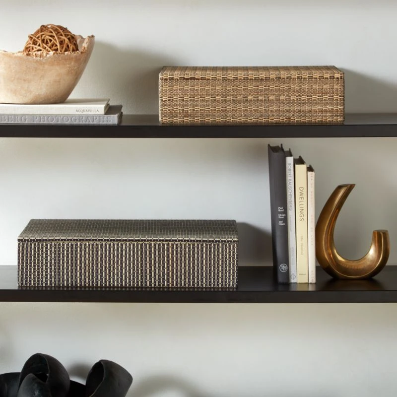 Crafted from woven Indonesian mendong and lined with soft faux suede, storage box is a fitting home for office accessories. Underneath a hinged lid, the tray is designed to store larger items, including legal-size paper. CB2 exclusive.