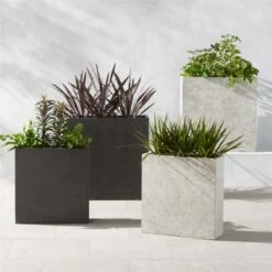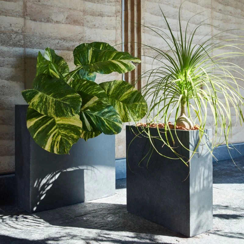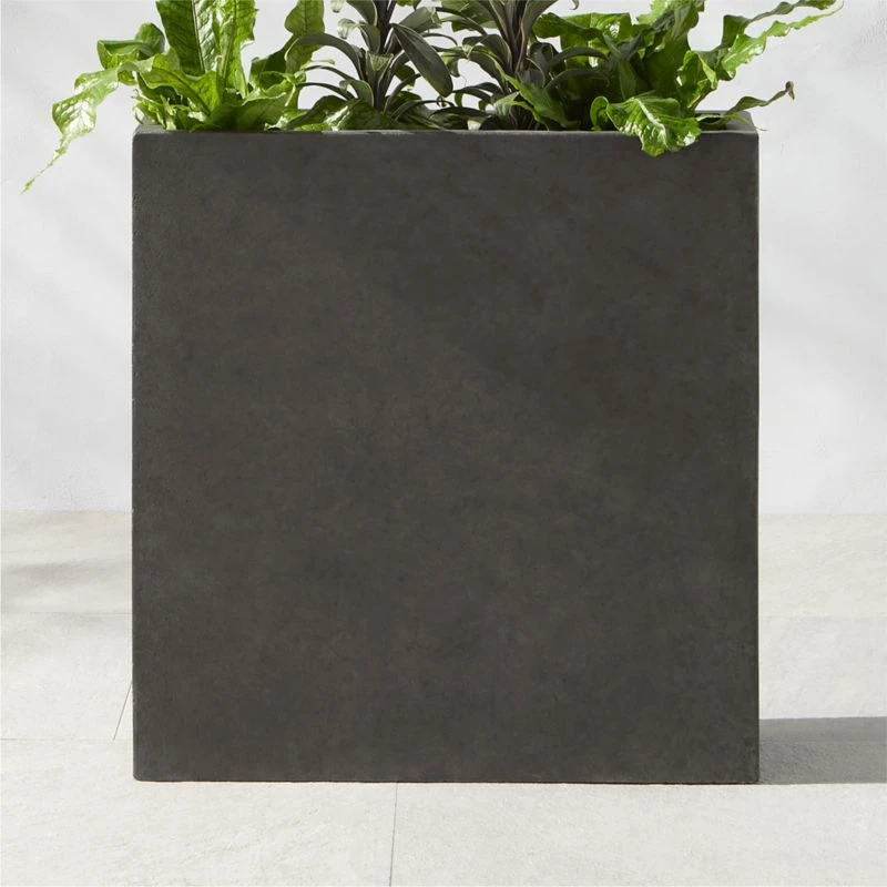 Overflowing greens contrast gorgeously with this industrial design in dark grey. Concrete squares up as a rectangular outdoor planter that forms a sculptural divide between spaces. CB2 exclusive.