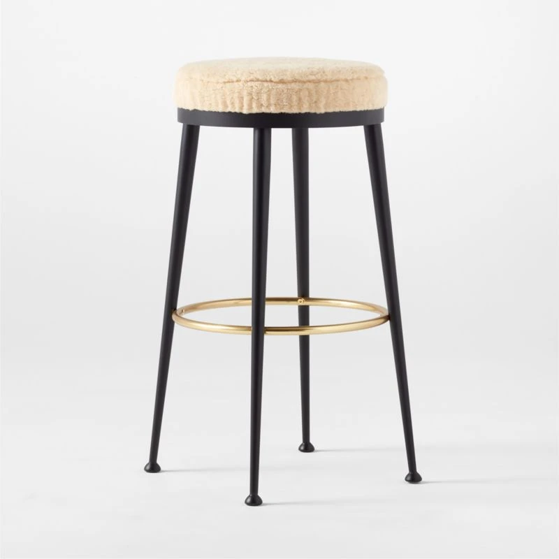 Caleb Zipper elevates the classic bar stool silhouette with high-end finishes. Iron tube frame features a rich, matte black, textured finish and round brass-plated foot rest. Seat is topped in 100% natural shearling for a luxe place to relax. Learn more about Caleb Zipperer on our blog. CB2 exclusive.