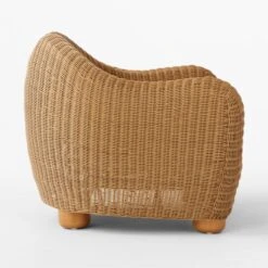 The bestselling Bacio upholstery collection goes outside in one of designer Ross Cassidy’s favorite materials: faux rattan that has all the natural appeal of the real thing, but will stand the test of time. Natural-toned all-weather lounge chair rests atop rounded eucalyptus wood feet and is exceptionally easy to live with, thanks to a cushion wrapped in off-white canvas twill Sunbrella performance fabric. CB2 exclusive.