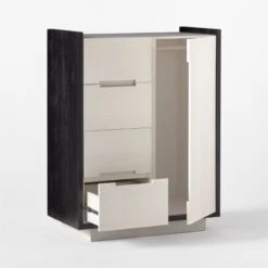 Designer Nicholas Obeid brings a graphic pop to the bedroom with this striking chifferobe. White washed solid acacia wood door and drawers are framed in contrasting blackened mango wood. Four drawers and a removable hanging bar inside the door provide ample storage. CB2 exclusive.