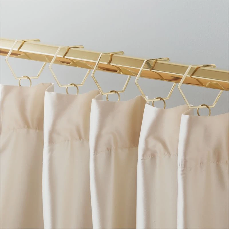 Set of nine polished brass drapery rings hang curtains in geometric form. An edgy complement to the Bolt curtain collection designed by Sasha Adler.