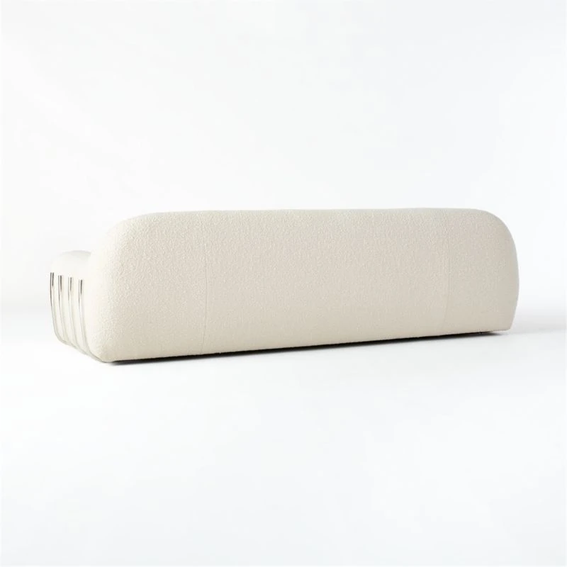 1970s Italian-inspired sofa designed by Jannis Ellenberger makes lounging look vintage. Curvaceous design is wrapped in a creamy ivory boucle that brings soft texture and dimension to the piece. Four metal braces add structural detail to each end. Luxe sofa is low, deep and so easy to sink into. Learn more about Jannis Ellenberger on our blog. CB2 exclusive.