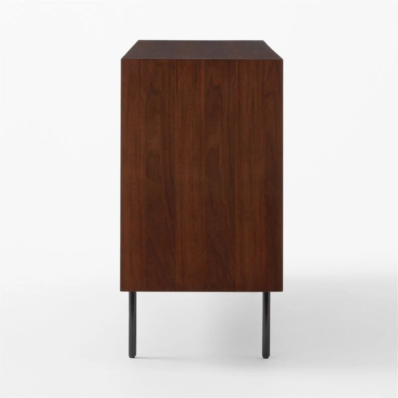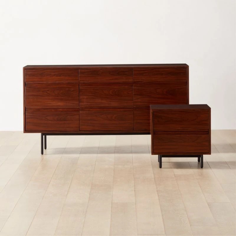Nine-drawer dresser by VUUE wears its Brazilian modernist influences well. Clean-lined frame of solid mindi wood is graced with a faux rosewood veneer whose rich grain contrasts with cylindrical metal legs. Soft-close, undermounted drawers glide smoothly to reveal ample room for clothes and accessories. CB2 exclusive.