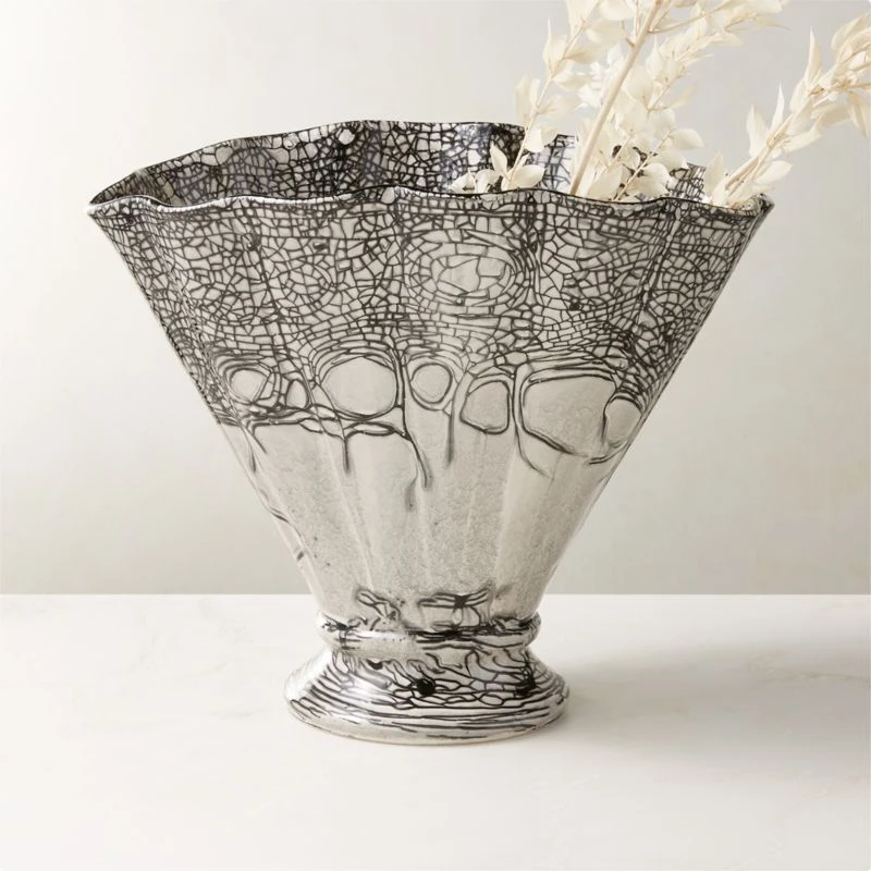Hand-thrown in Italy, the Cavo Vase elevates the classical fan form with an intricate, craquelure-inspired pattern. Dramatic scalloped flare tapers down to a round foot, all coated in a high-contrast black reactive thrice-fired glaze. Each vase will vary slightly both in shape and glaze application. Ideal for dried and faux botanicals, or display in an art object collection.