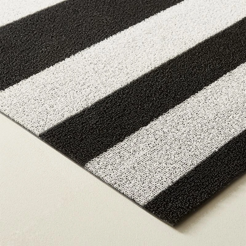 Made exclusively for CB2, this modern grey and black stripe utility mat is tufted from durable yarns for a textured look that’s perfect for bathrooms, kitchens, patios and entryways. Hard wearing vinyl resists mold. So easy to clean, just vacuum, shake or hose off.