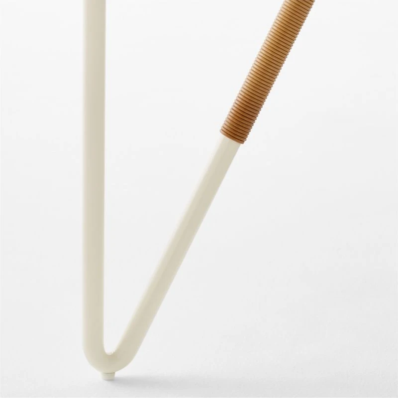 Paying homage to 1960s-style French villas, outdoor dining table by Ross Cassidy is understated in its luxury. Angular steel frame, powdercoated in ivory, is accented by wrapped all-weather rattan. Tempered glass top allows clear views of this modern vintage design. Sized to fit on a terrace, this table is ideal when styled as part of a conversation set. CB2 exclusive.