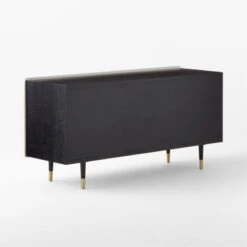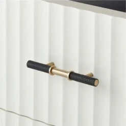 Ebonized oak frames this black and white Caleb Zipperer-designed dresser in stark contrast. Four wavy hi-gloss white drawers tuck away clothes and other necessities. Brass handles with black faux leather detail complete the elevated look. Learn more about Caleb Zipperer on our blog. CB2 exclusive.
