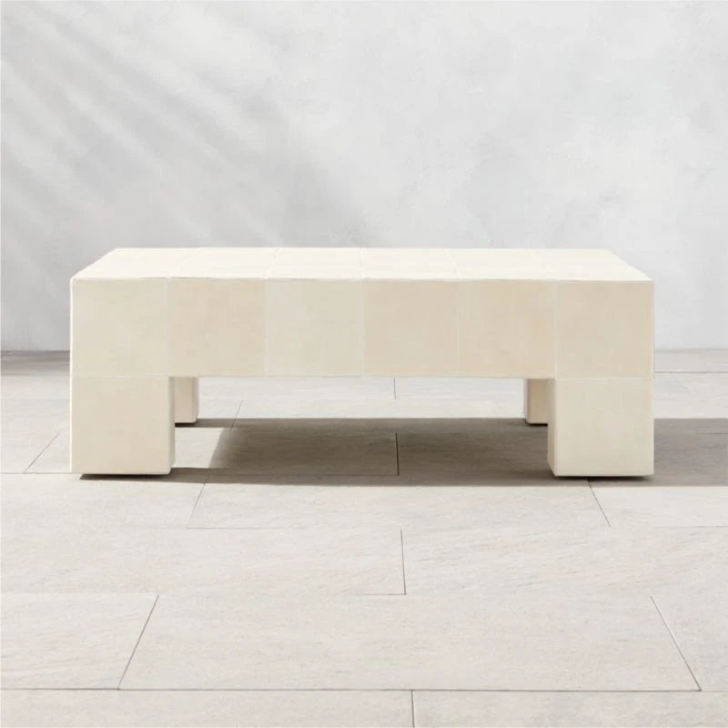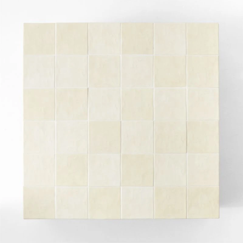 Hand-laid by skilled artisans, white ceramic tiles completely cover this modern outdoor coffee table by VUUE. Tonal variations in the tiles form a high-low grid pattern that’s unique to each piece. CB2 exclusive.