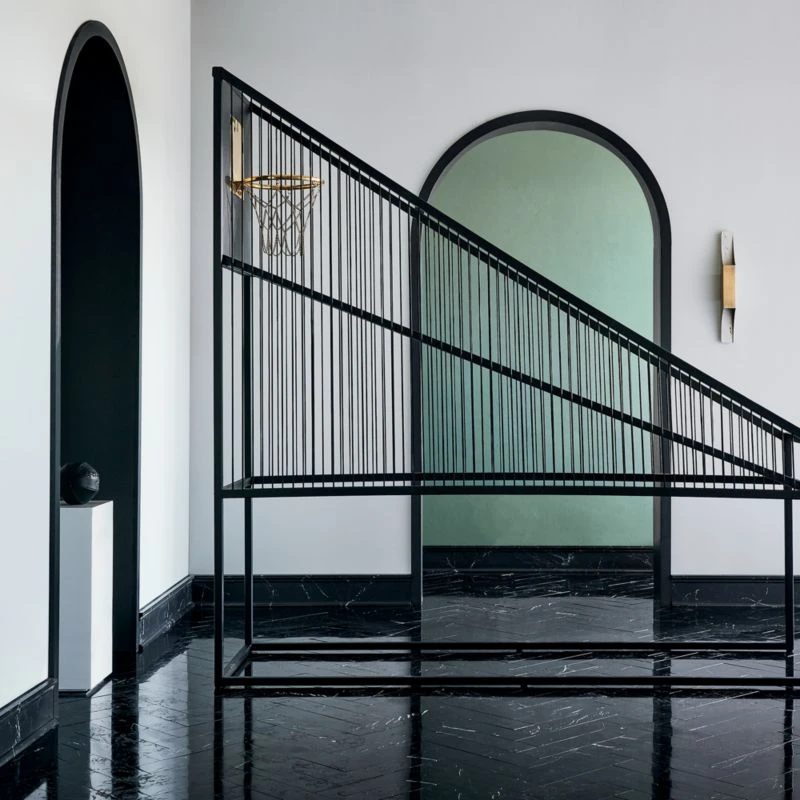This is gametime with a velvet rope. Thanks to Barcelona-based design team Mermelada Estudio, the classic basketball arcade game just got a super-luxurious, high-fashion upgrade. Features black genuine leather and unlacquered brass backboard with cast brass hoop and chain; ramp and side rails are also clad in leather. Black nylon chording keeps the ball in play. All handsomely squared off with a matte black powdercoated steel frame. A truly covetable statement piece that redefines sport decor through the lens of luxury and where every shot is a bank shot. And don’t forget to fill up the rack with a few of our Leather Head Mini Black Leather Basketballs. CB2 exclusive.