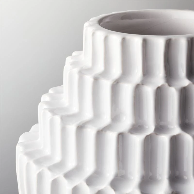 Hand-thrown watertight vase steps up to house flowers in soft brutalist style. Locally sourced clay is formed by hand on a potter’s wheel, then carved with a grooved design and glazed white. A sculptural, statement-making way to add texture to your home. CB2 exclusive.