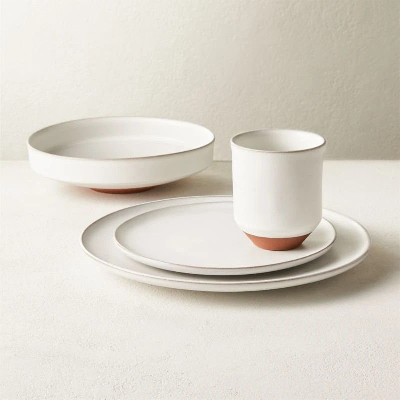 Handmade terracotta dinnerware features a beautiful tapered shape and unique glazing technique. Matte white is strategically applied to reveal hints of the terracotta underneath. Exposed terracotta will have slight variation in color from piece to piece. Feels like it came out of your local pottery studio. Includes dinner plate, salad plate, pasta bowl and mug. CB2 exclusive.