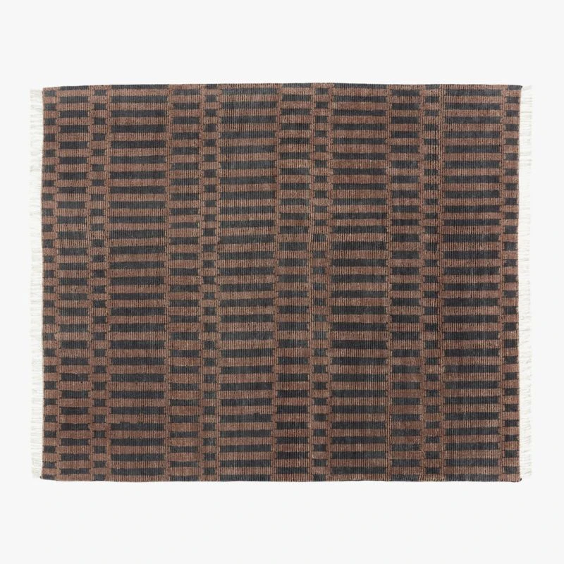 Designed by Studio Anansi and handmade by master craftsmen in Bhadohi, India. Black and brown patterned rug is hand-knotted of 100% New Zealand wool for a softer, more luxe pile than other wools. Eight to nine knots per square inch with handbound edges, rug is washed to enhance its naturally plush feel. Learn more about Studio Anansi on our blog. CB2 exclusive.