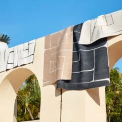 Designed by London-based Studio Anansi, reversible area rug offers durability and a touch of pattern to outdoor spaces. Handwoven of 100% certified recycled polyester, the contrasting pattern reflects the refined designs of indoor textiles while resisting the elements. CB2 exclusive.