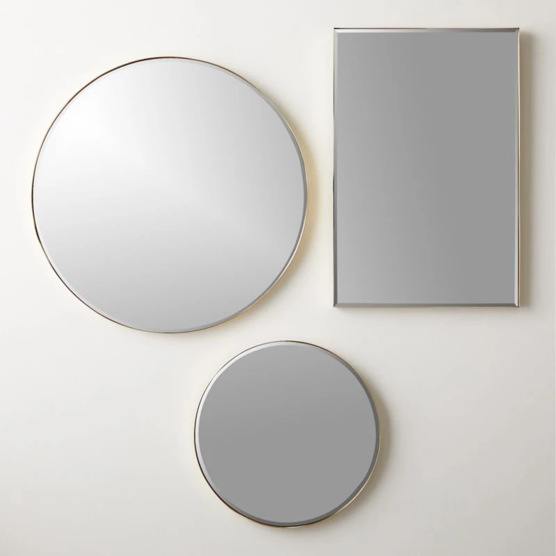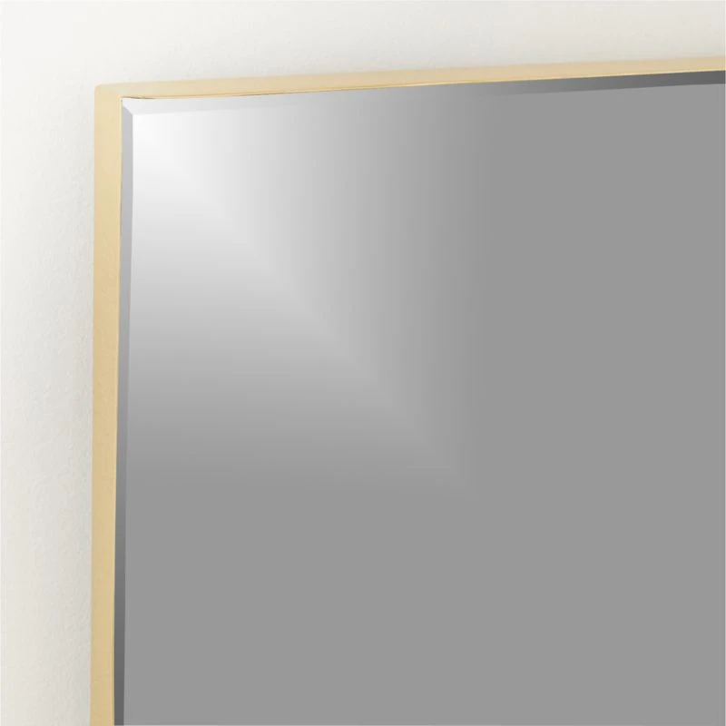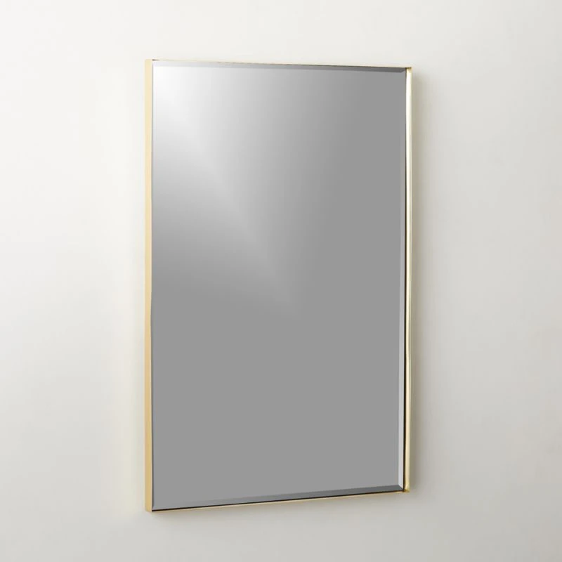 Beveled edges and brass line up in a handcrafted rectangular mirror that boasts both simplicity and depth. Solid polished brass creates an elevated look that hangs stunning above a vanity or as a goes-anywhere decor piece. Part of the Graduate mirror collection. CB2 exclusive.