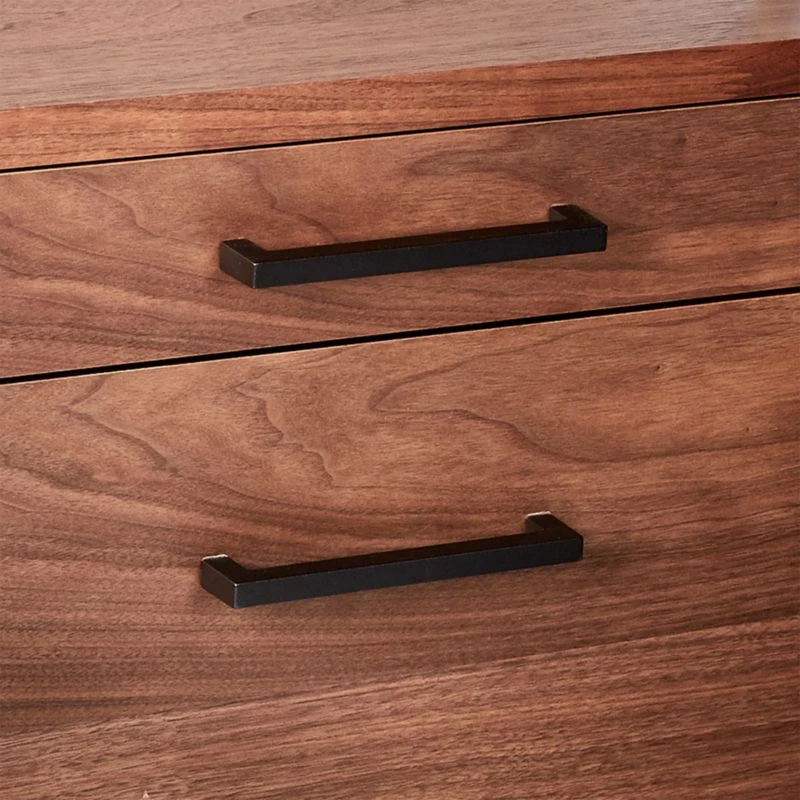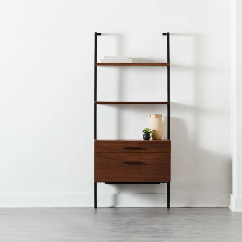 Fresh feels for a cult favorite. Storage sits on top of storage when rich walnut veneer shelves meet two cabinet drawers. Powdercoated metal frames hold everything in place while space-saving modular design allows for dramatic repetition down the wall. A stylish sidecar when riding next to our Helix walnut desk. Stud mounting recommended; hardware included for drywall installation. CB2 exclusive.