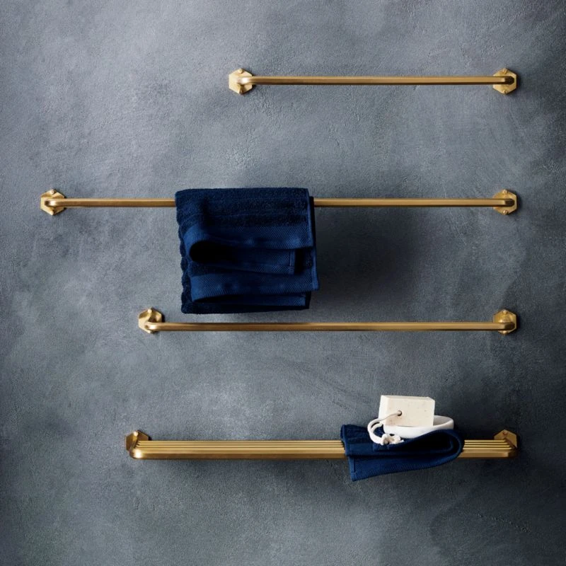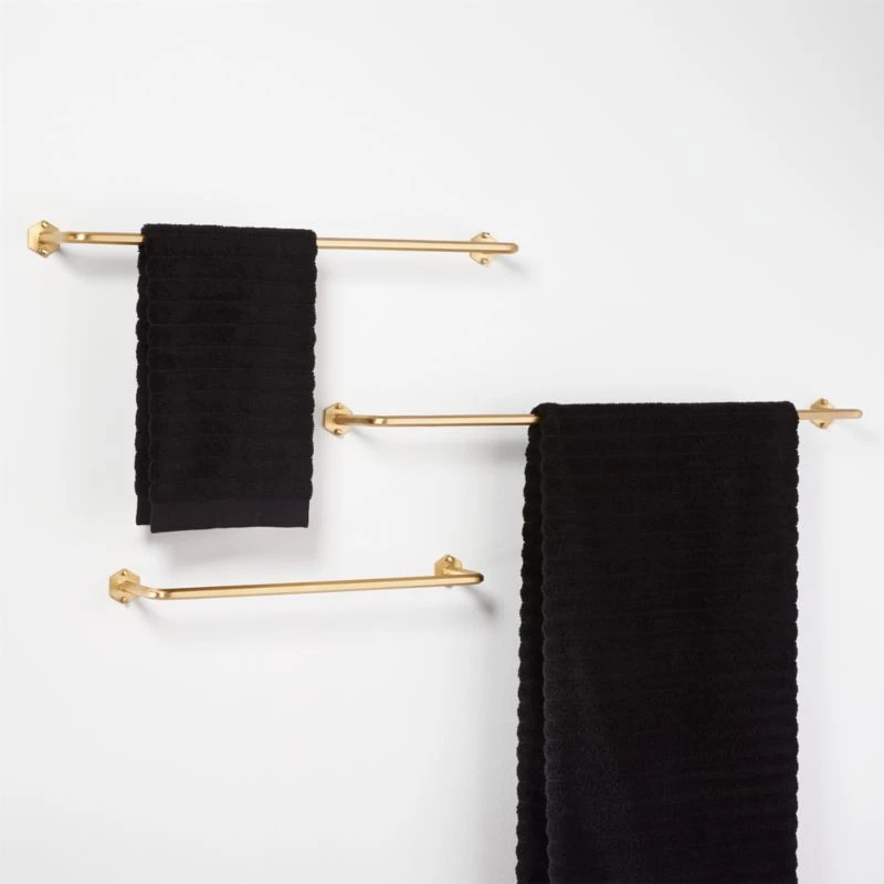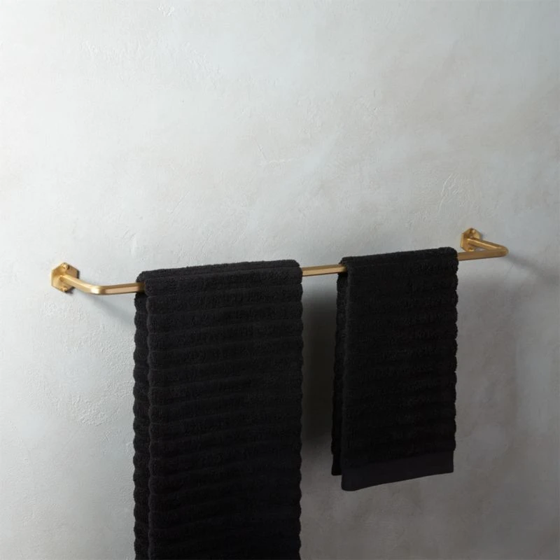 Graphic hexagon in warm brass elevates towels with chic sophistication. Pair with Hex toilet paper holder to complete the look. Hex Brass Towel Bars is a CB2 exclusive.