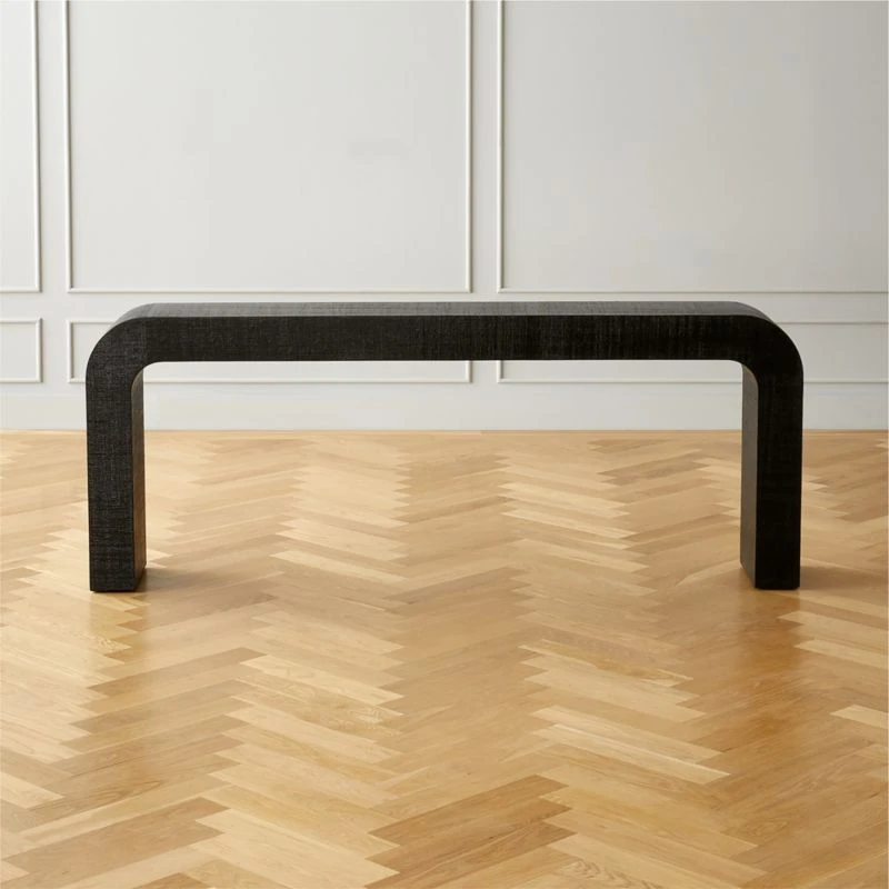 Inspired by 1970s modern silhouettes and unique materials, VUUE’s design turns a simple U-shaped form into a statement console table with extra-rich texture. Raffia wraps the piece, finished in hi-gloss black. Mixes effortlessly with any modern living situation. Learn more about VUUE on our blog. CB2 exclusive.