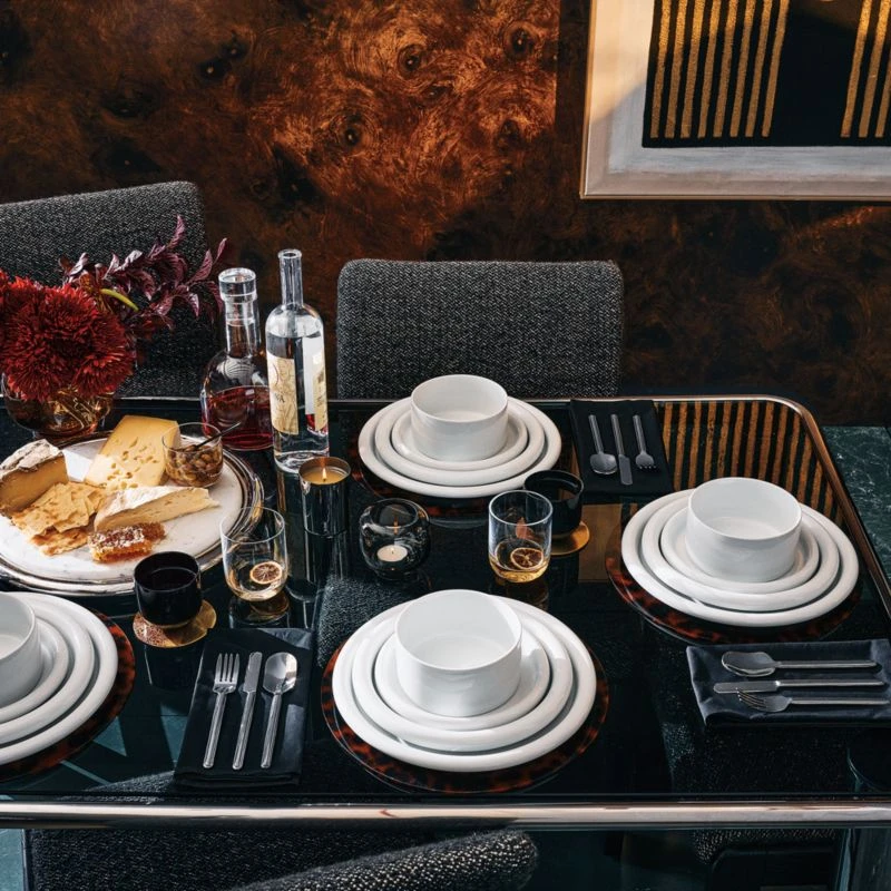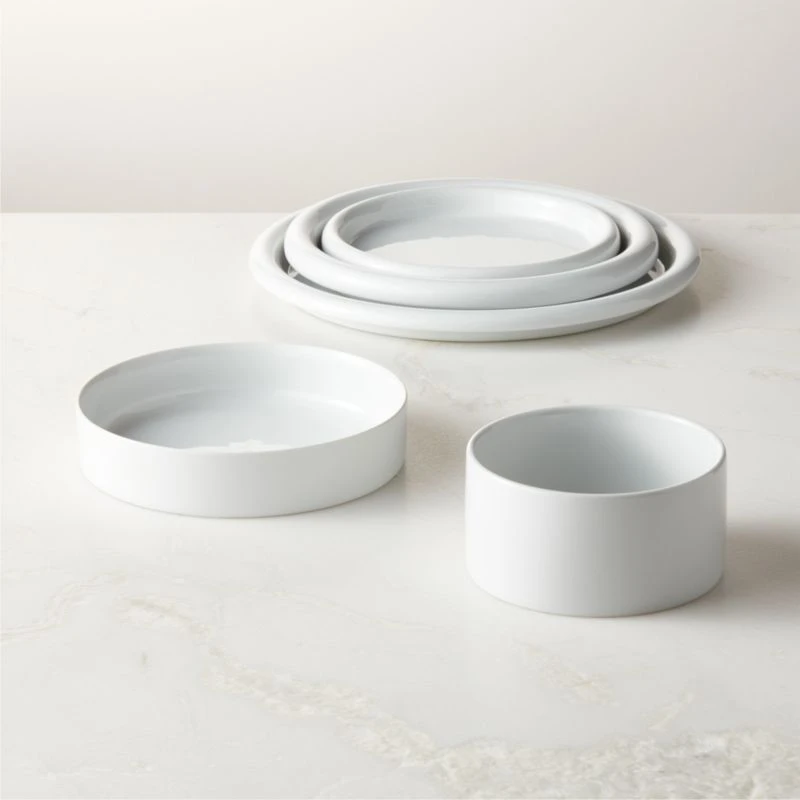 Originally designed by Gianfranco Frattini in 1981, this dinnerware collection has an ingenious modular concept. Low plates in shiny white porcelain sport rolled rims that allow them to nestle into one another, bringing proportional grace to the table. Drawing upon Frattini’s expertise in architecture, this reintroduced collection is the perfect artistic accent for special gatherings and everyday meals alike. CB2 exclusive.