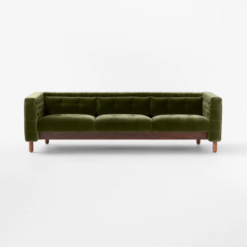 This sleek, low sofa was originally created by iconic Italian designer Gianfranco Frattini for the fashionable Restaurant St. Andrews in the heart of old Milan. Now, a modern classic returns with the same spirit of the original design, reimagined in a rich, olive green-colored velvet with room for three. Period-authentic details include hand-sewn button tufts on the interior sides and cushions, along with the inset walnut legs that are characteristic of the designer’s signature style. CB2 exclusive.