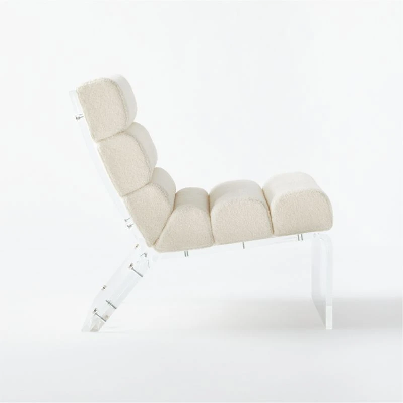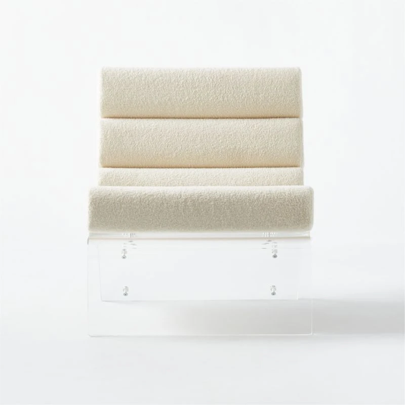 Sculptural and plush statement chair by Mermelada Estudio mixes all the right materials. Inspired by a vintage ’70s chair, horizontal channels of ultra soft white boucle fabric line a sculpted acrylic base. Polished nickel hardware adds finishing details to the back. Learn more about Mermelada Estudio on our blog. CB2 exclusive.