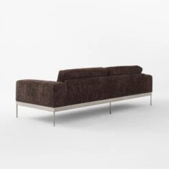 Sleek sofa by VUUE cuts a modern profile with wide arms, deep seat and slim, blackened stainless steel base. Low, loose back cushions feature a single channel tuft in the center, adding interest to this timeless silhouette. Especially inviting in a black textured chenille fabric that instantly updates any room. CB2 exclusive.