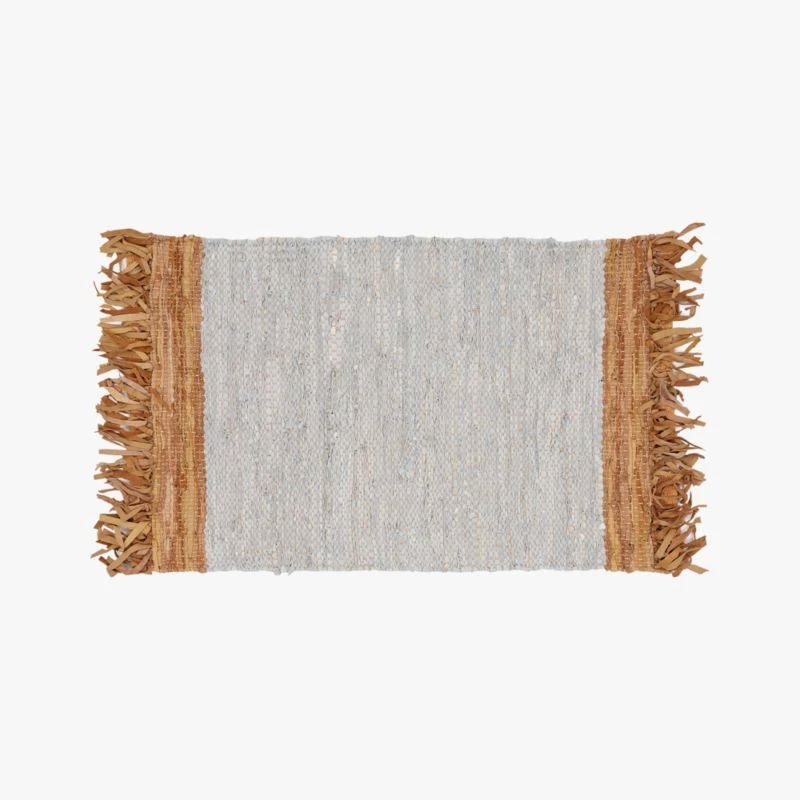 Handwoven on a traditional pit loom using soft leather upcycled from shoe and bag factories. Cool steel grey weaves a modern neutral field banded by caramel and edged in exaggerated fringe. Doesn’t slip, perfect for high-traffic areas like the entry or under the dining table. Great for pets, too.