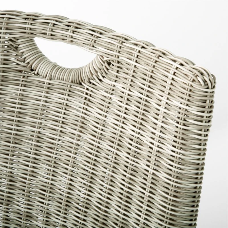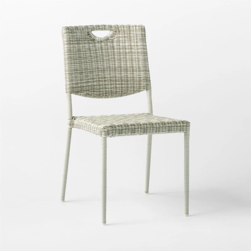 Outdoor dining chair by Ross Cassidy brings European styling to the terrace—with a twist. Steel frame is fully wrapped with woven variegated outdoor all-weather rattan in ivory for a vintage-inspired piece that’s designed to weather many seasons to come. Stackable and easy to maneuver thanks to an integrated handle, too. CB2 exclusive.