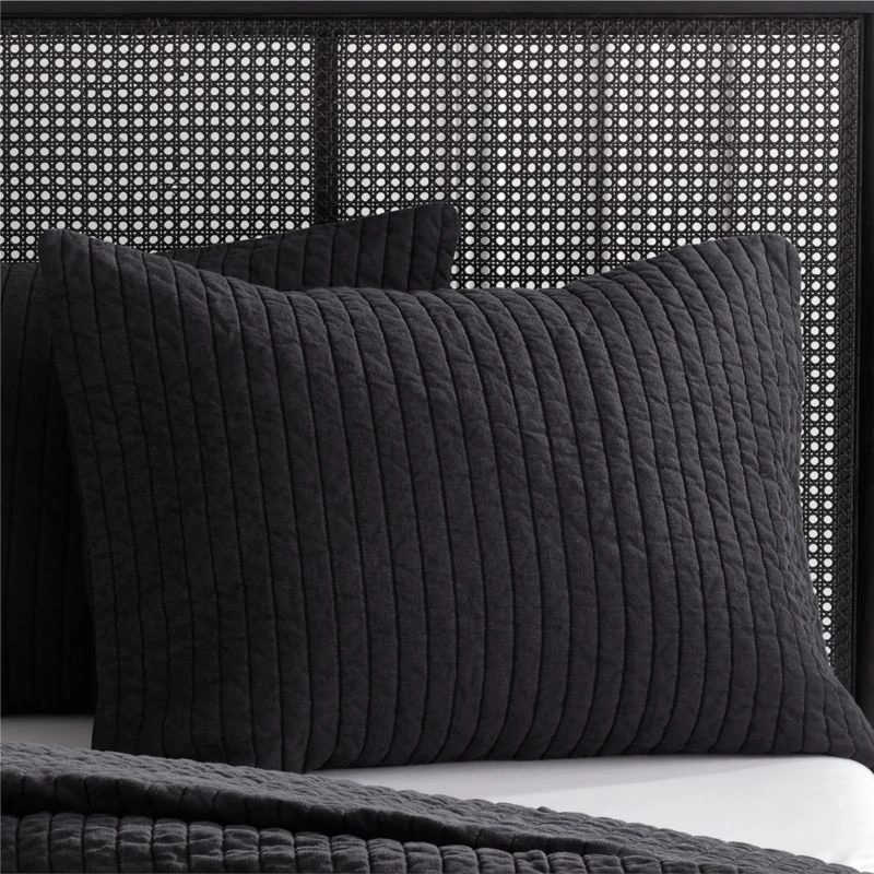 Lightweight black linen shams elevate the bedroom with effortless cool. Garment washed for a lived-in vintage look. Detailed stitching adds channeled texture to the front. Pair with matching duvet to complete the look. CB2 exclusive.