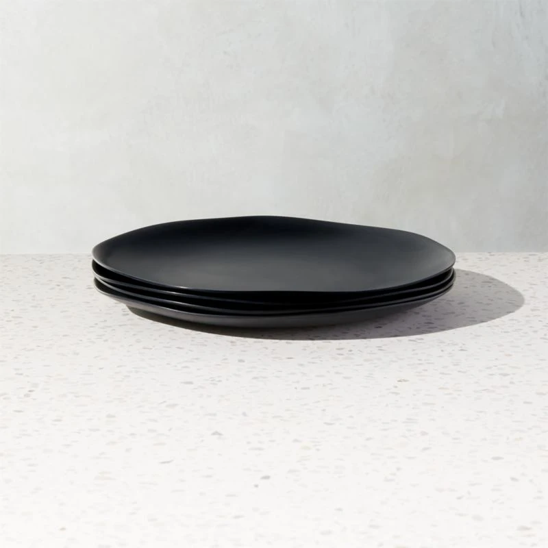 Designed to mimic the look of hand-thrown stoneware with organic edges and slightly varied shapes, matte black melamine plates set a chic outdoor table. Layer and pair with the full Pebble dinnerware and collection for al fresco-approved entertaining. CB2 exclusive.