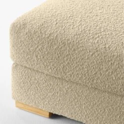 Long, lean ottoman lounges low on four solid hardwood feet—an elevated update that appreciates high-end craftsmanship and honest materials. Clean silhouette has a plush, pillowed feel thanks to the feather-down cushion design. Soft camel boucle plays well against the contrasting hardwood feet. Combine with other Piazza sectional pieces for a configuration that suits your space. CB2 exclusive.