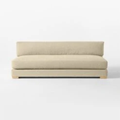 Long, lean, super-deep sofa lounges low on four solid hardwood feet—an elevated update that appreciates high-end craftsmanship and honest materials. Clean silhouette has a plush, pillowed feel thanks to the feather-down cushion design. Soft camel boucle plays well against the contrasting hardwood feet. Combine with other Piazza sectional pieces for a configuration that suits your space. CB2 exclusive.
