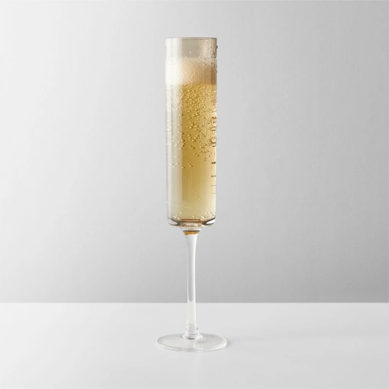 Handblown champagne flute with elongated, straight sides and soft round detail offers crisp sips from a fine, hand-polished rim. Smokey-grey tint with a bit of luster cases only the bowl while the base and stem remain crystal-clear. Pair with Porcha Red and White Wine Glasses to complete the collection. CB2 exclusive.