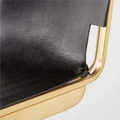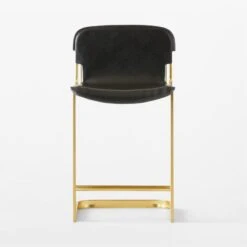 The Rake Black Barstool was designed exclusively for CB2 in collaboration with Kravitz Design by Lenny Kravitz. A fashion-forward pairing of supple leather and slick metal. Gleaming brass-plated brushed steel frame is outfitted in a genuine black leather sling. Finished with a raw edge for a handmade and crafted appeal, natural hide will wear beautifully and become even more conditioned over time. Chair’s architectural design is thoughtfully engineered to look striking from every angle with a continuous, cantilevered base that adds a little bounce to the sit.