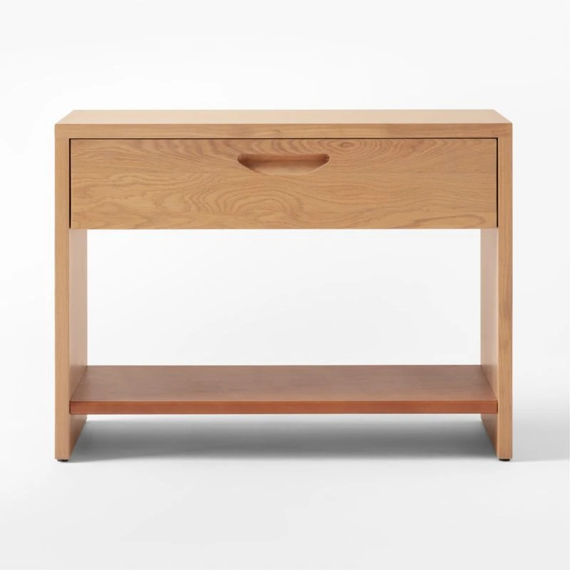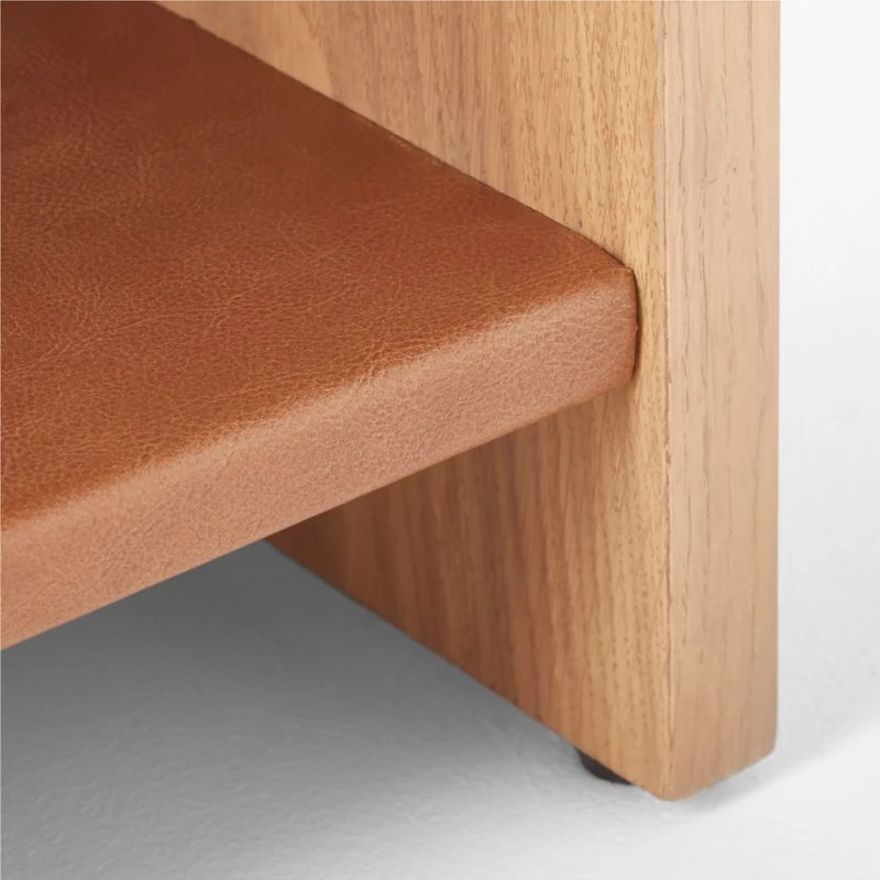 From across the bedroom, the simple form of Lawson-Fenning’s nightstand invites a closer look; upon second glance, its details stand out. White oak, certified sustainable by the Forest Stewardship Council ®, features beautiful grain and dovetail joinery construction—a technique used by master woodworkers. Bottom shelf is wrapped in saddle leather for understated luxury, while soft-close glides and a routed handle bring small pleasures to everyday functions. CB2 exclusive.