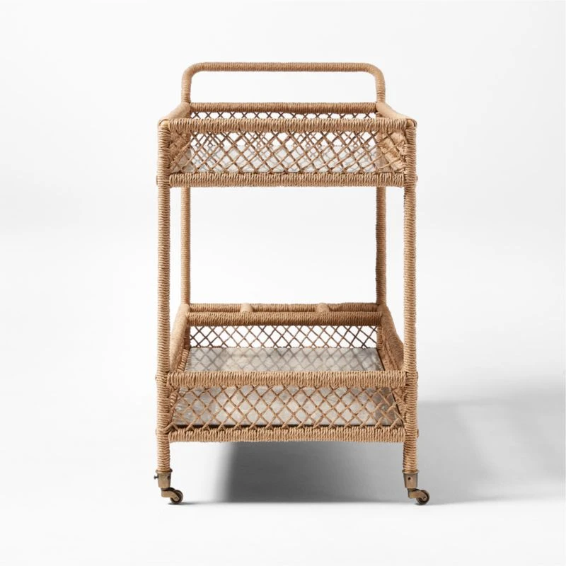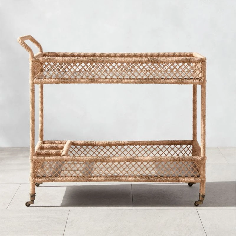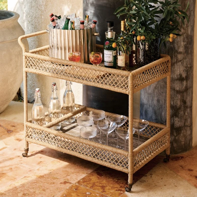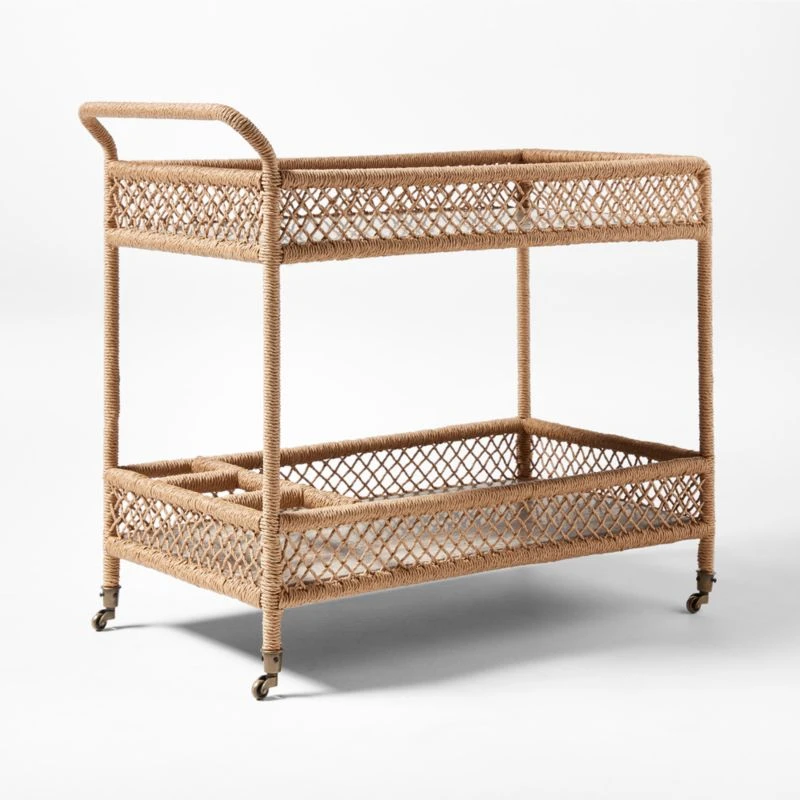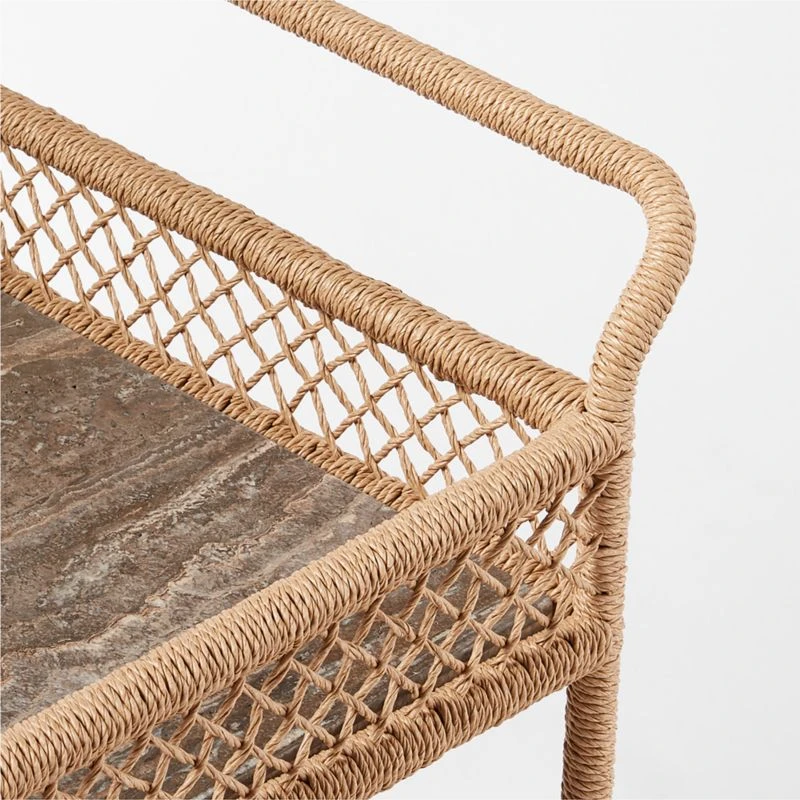 The Remo Suite evokes classic French designs and summers along the Riviera, spritz in hand. Ross Cassidy-designed outdoor bar cart features all-weather rattan, twisted and cross-woven around the frame for a casually elegant feel, all crowned by a rich brown travertine top for mixing and serving drinks. A lower storage area offers compartments for bottles, glasses and other entertaining necessities. Due to the inherent variation of travertine, no two pieces will be identical. CB2 exclusive.