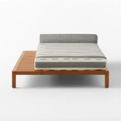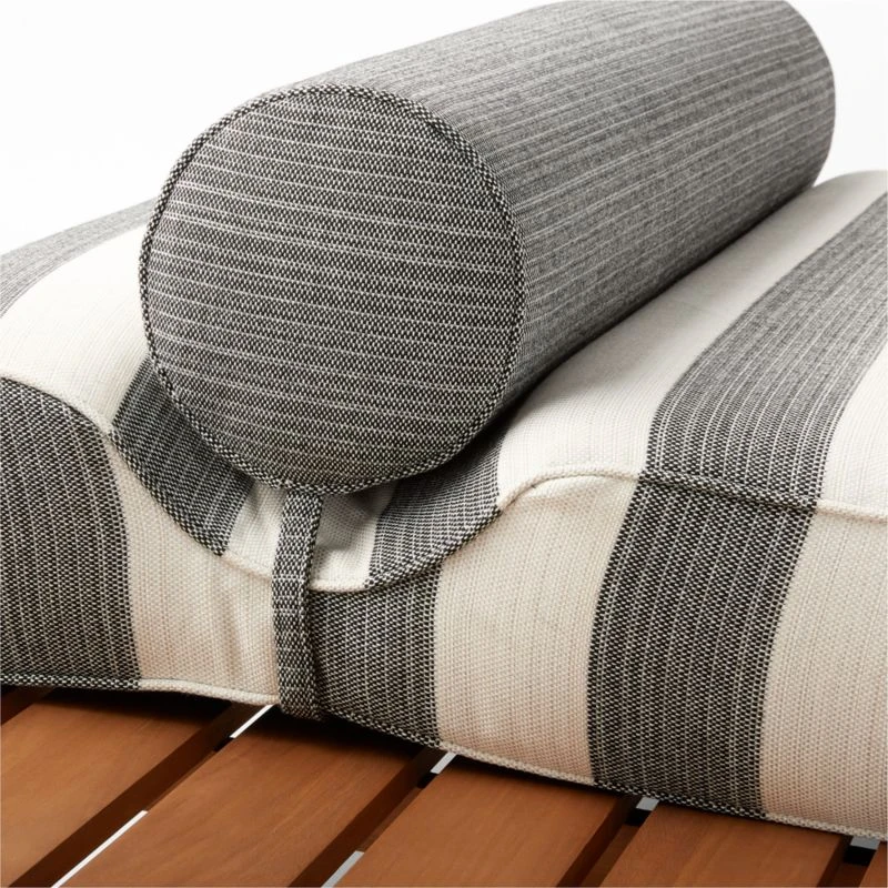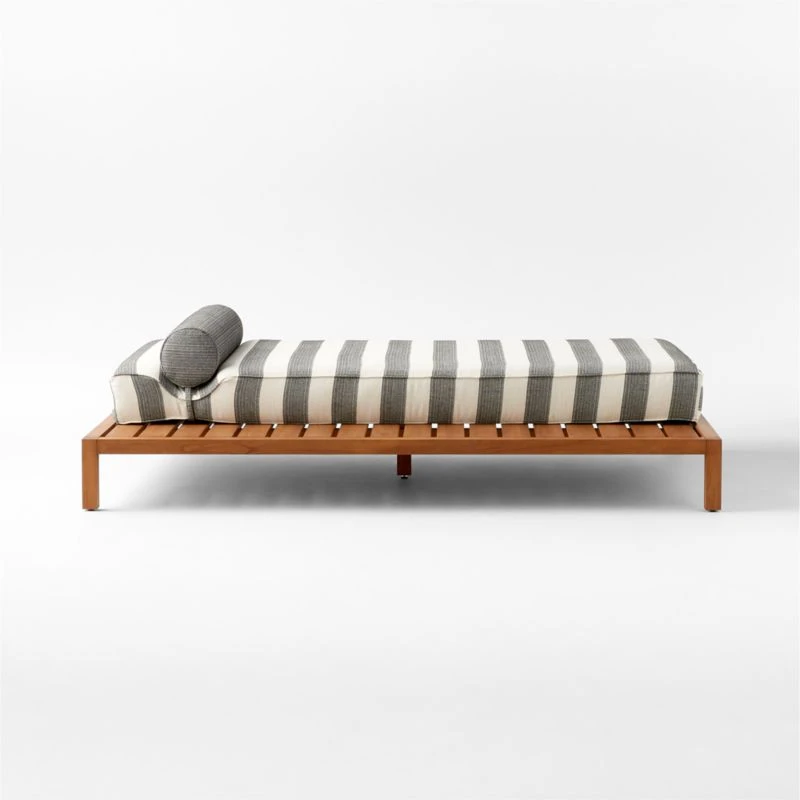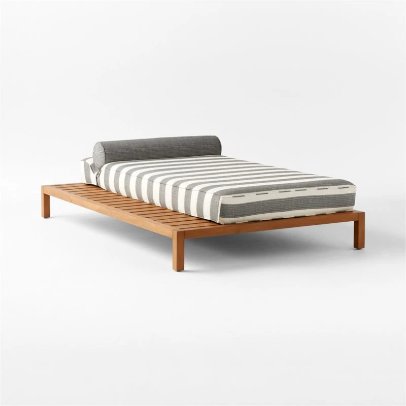 Outdoor daybed by Mermelada Estudio provides abundant space for stretching out. Oversized base is constructed of natural stained teak certified sustainable by the Forest Stewardship Council ® (FSC), with slats to support the generously proportioned cushion in textured natural and black stripe Sunbrella ® performance fabric. A coordinating black bolster pillow nestles into a cutout detail for a smart, tailored look. CB2 exclusive.