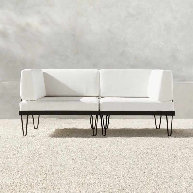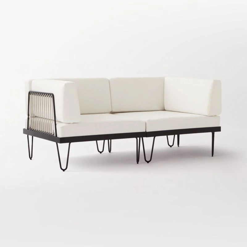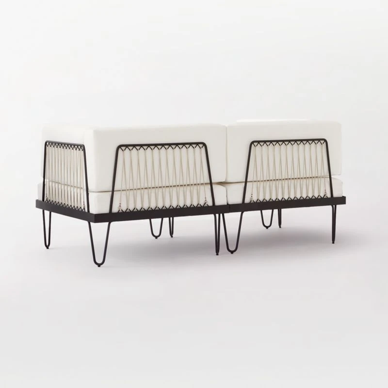 Solid rod frame and legs showcase nautical rope detail in a two-piece outdoor loveseat made for lounging. We couldn’t resist adding a tiny red, white and blue ribbon to the rope—a nod to the piece’s French Industrial inspiration. Soft white cushions feature durable all-weather upholstery. CB2 exclusive.