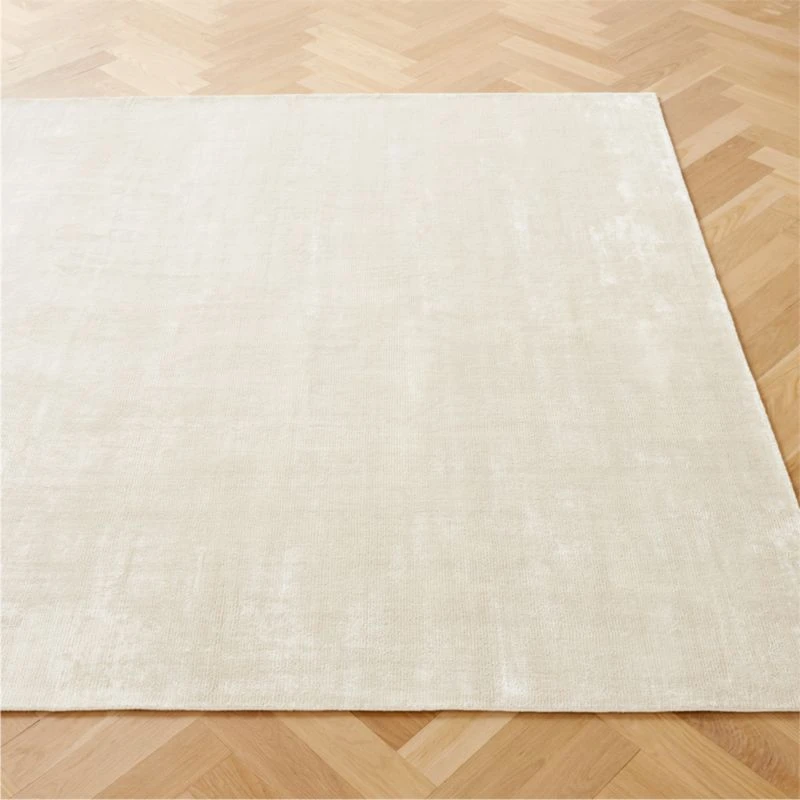 Warm ivory viscose rug echoes the soft hand and luster of a silky velvet with visible warp yarns underneath. Composed of a combination of looped and cut viscose, the handloomed pile takes on tonal highs and lows as the light changes throughout the day. CB2 exclusive.