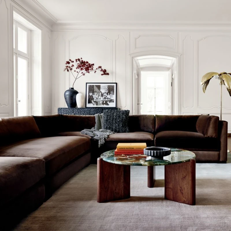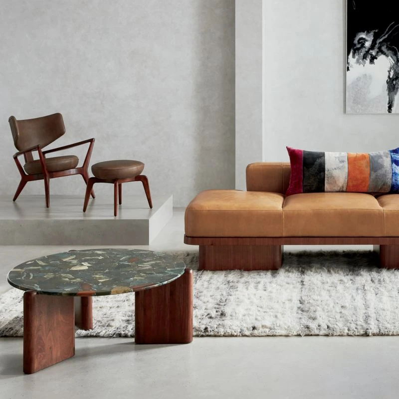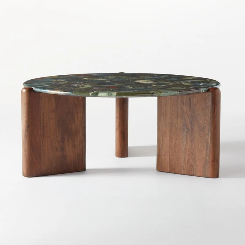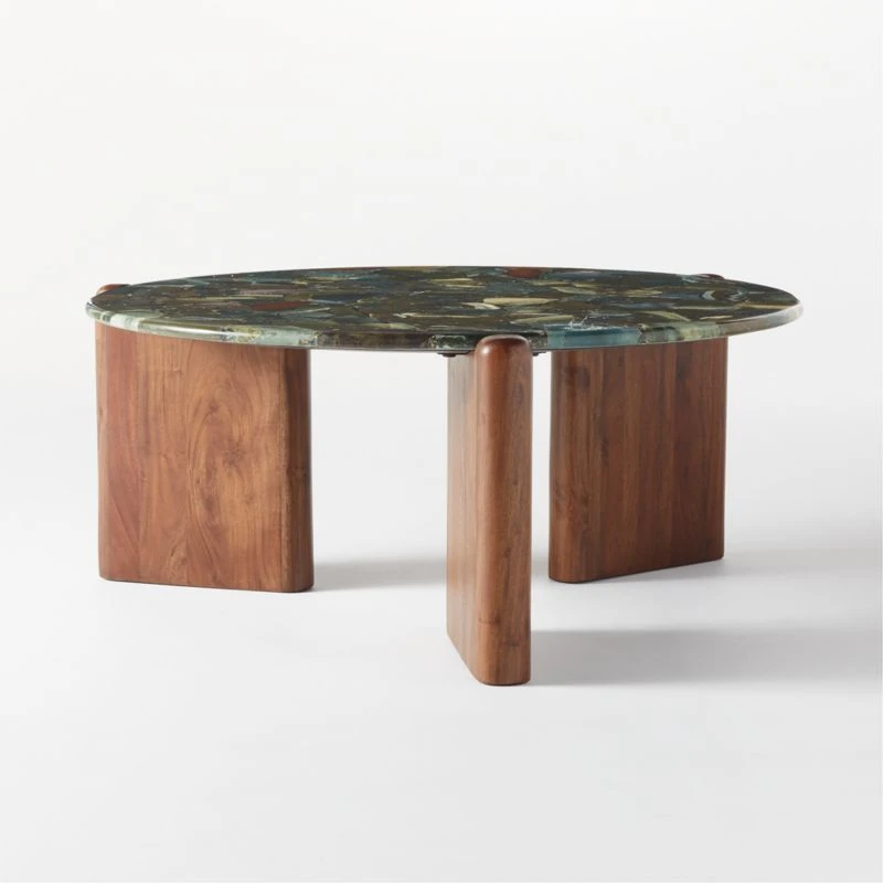 Minimal design meets the luxest of materials in this statement coffee table. A polished round of solid green agate rests on three acacia wood legs, with a refined bullnose edge for a sophisticated finish. Active with dashes of browns and creams, each piece of agate is unique—a rare and special piece considering we only made a few. CB2 exclusive.