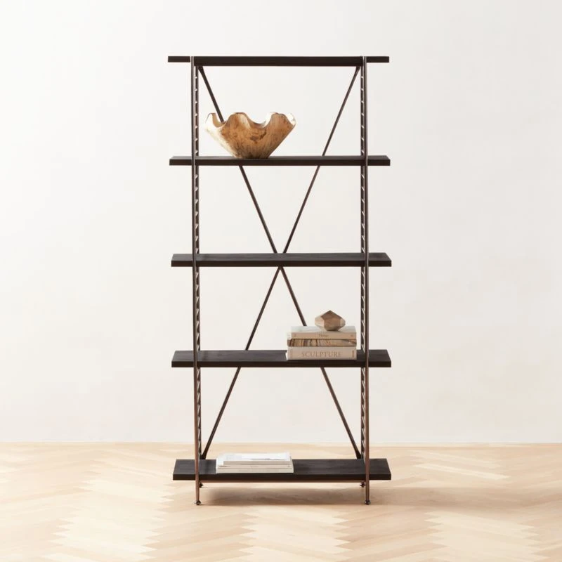 Shelves wirebrushed for texture and finished with a black stain, open bookshelf designed by VUUE suspends books, photos and artwork on a black iron tubing frame. Three adjustable shelves rest in the middle while the top and bottom stay fixed. CB2 exclusive.