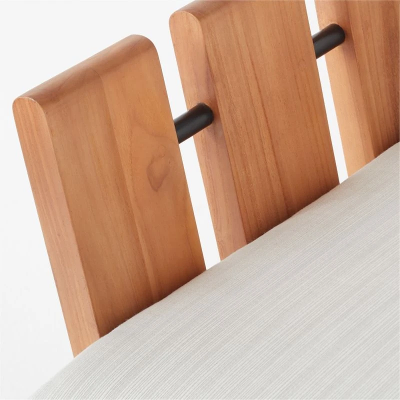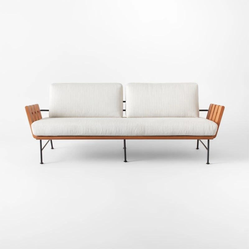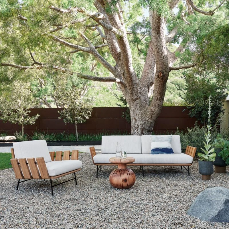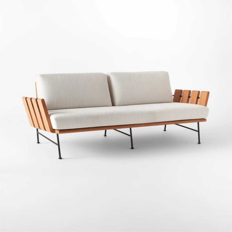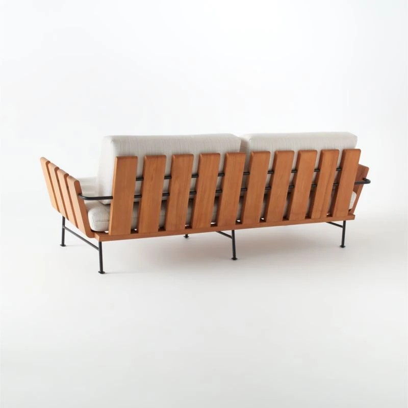 A personal collection favorite of California design duo Lawson-Fenning, outdoor sofa captures the beautiful tension between substance and negative space. Crafted from wood certified sustainable by the Forest Stewardship Council, chair’s teak vertical slats have a curved bullnose edge for style and comfort. Black powder-coated iron tubes provide connection and support, while plush removable cushions are covered with textured outdoor Perennials® performance fabric for superior durability and resistance to weather and fading. Due to the nature of teak, wood can vary in color; if left uncovered, wood will patina to a beautiful silver grey color. CB2 exclusive.