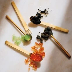 Party smart itsy forks in 18/8 brushed gold stainless steel with polished prongs. Flat modern shapes with great heft and head to handle all the apps. Matching spreaders/spoons available.