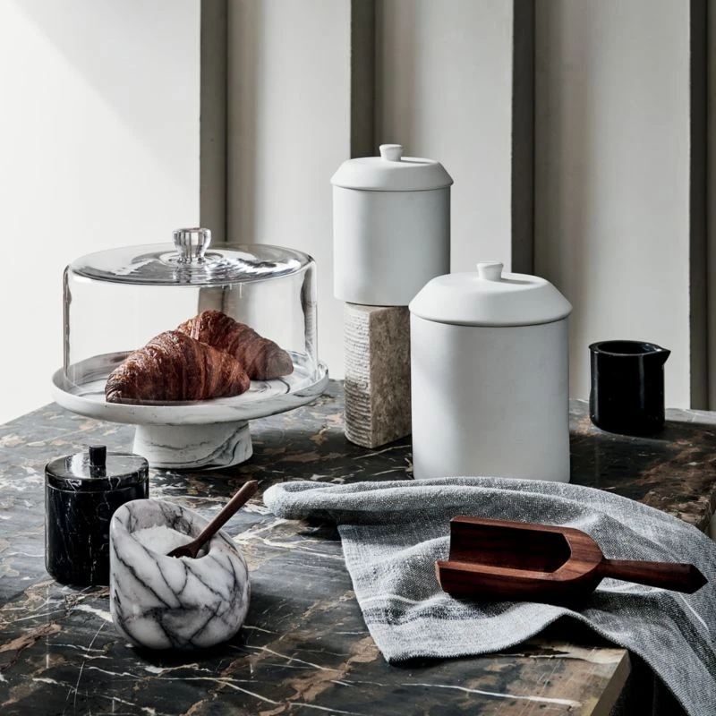 Cement canisters by Jennifer Fisher are topped with angled lid and round handle featuring hand-cut screw detail inspired by her iconic jewelry designs. “I love having these in my kitchen,” Jennifer says. “I put everything in them, from snacks to baking supplies.” Silicone gasket locks in the freshness. CB2 exclusive.