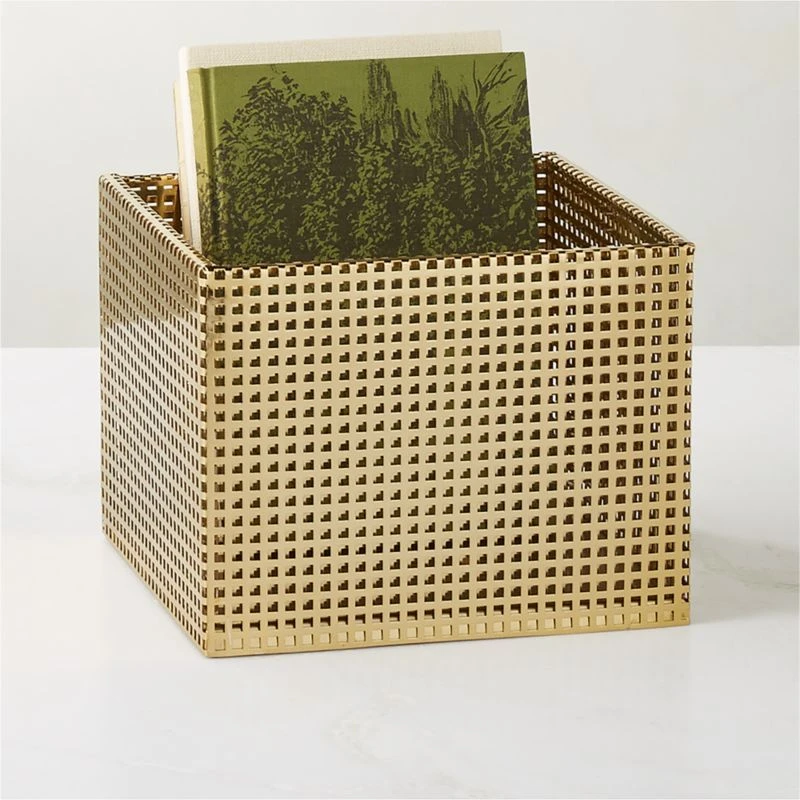 Polished brass storage basket is ideal for stashing magazines, textiles and other everyday items. Perforated material is folded and welded by hand, creating a rigid rectangular structure that functions brilliantly as attractive bookshelf storage. CB2 exclusive.