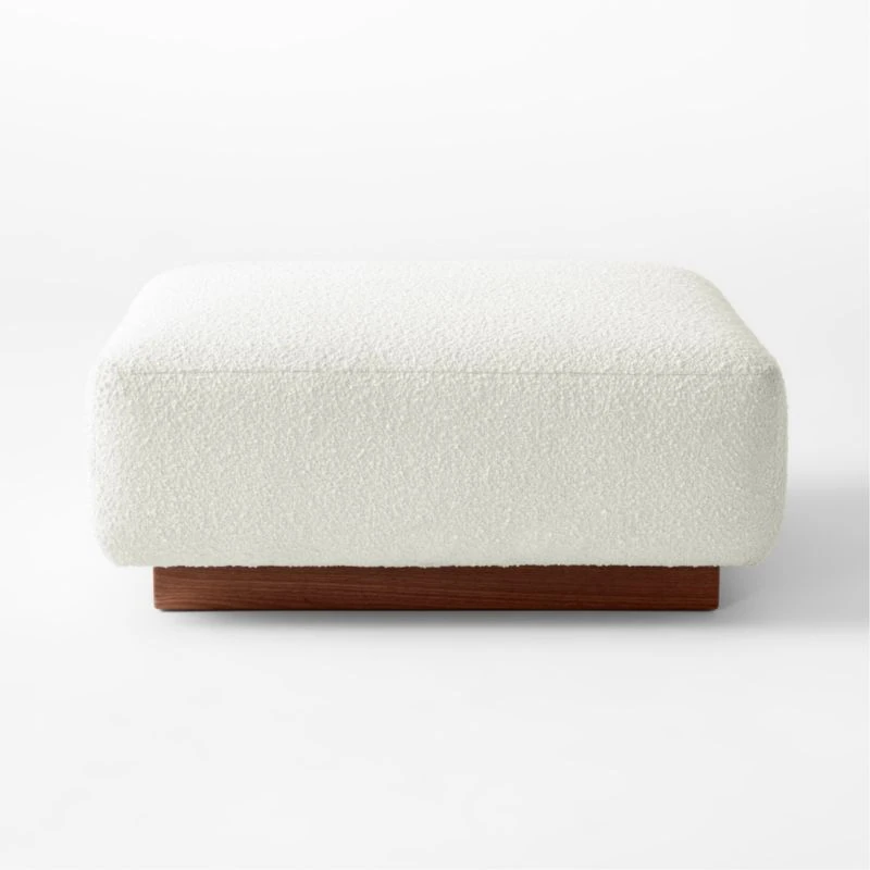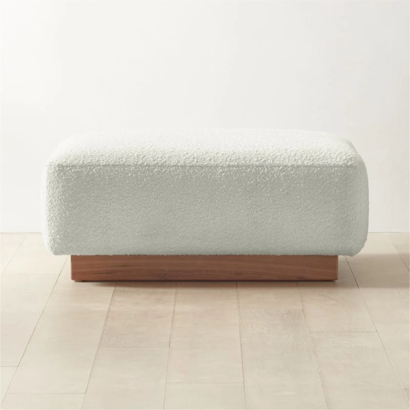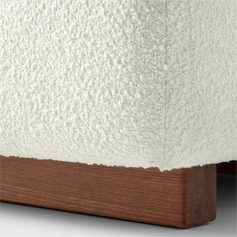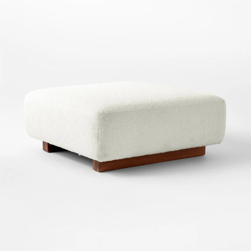 Designed by Lawson-Fenning, the Terrain furniture collection consists of modular pieces that can be arranged to create different environments. Ottoman features plush bouclé upholstery. Walnut base, certified sustainable by the Forest Stewardship Council ®, reveals warm tones and striations that vary from piece to piece. Complements other pieces in the Terrain furniture collection. CB2 exclusive.