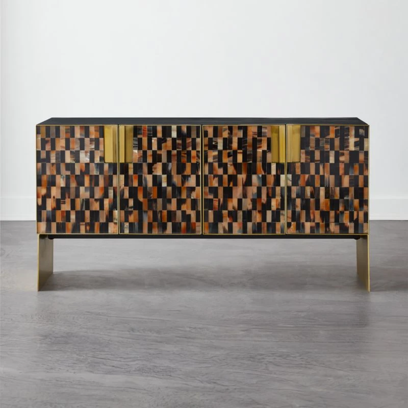 Designed by VUUE, dark acacia wood credenza makes a graphic statement in any living space. Responsibly sourced horn is hand-laid by skilled artisans in India, making each piece truly unique. Four doors open with integrated handles to reveal two shelves inside. Two thin, matte brass-finished legs elevate the piece. Learn more about VUUE on our blog. CB2 exclusive.