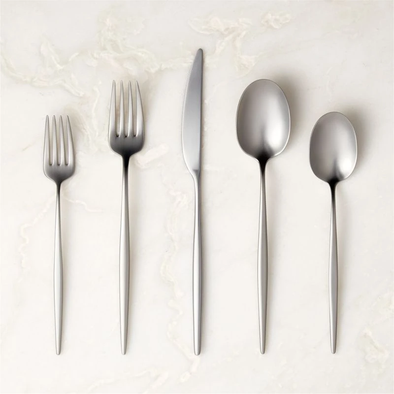 Sleek, tapered flatware set is uniquely processed to get its signature velvety texture. An elevated take on your everyday classic. We especially love it paired with the graphic black and white of the Fynn Dinnerware collection. CB2 exclusive.